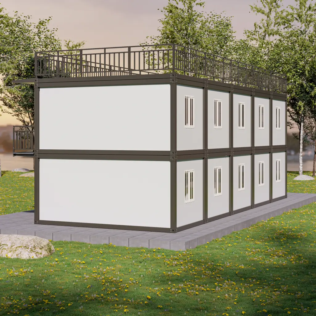 Prefab multi-room container building with an external staircase and spacious roof terrace. Durable and fast to deploy.