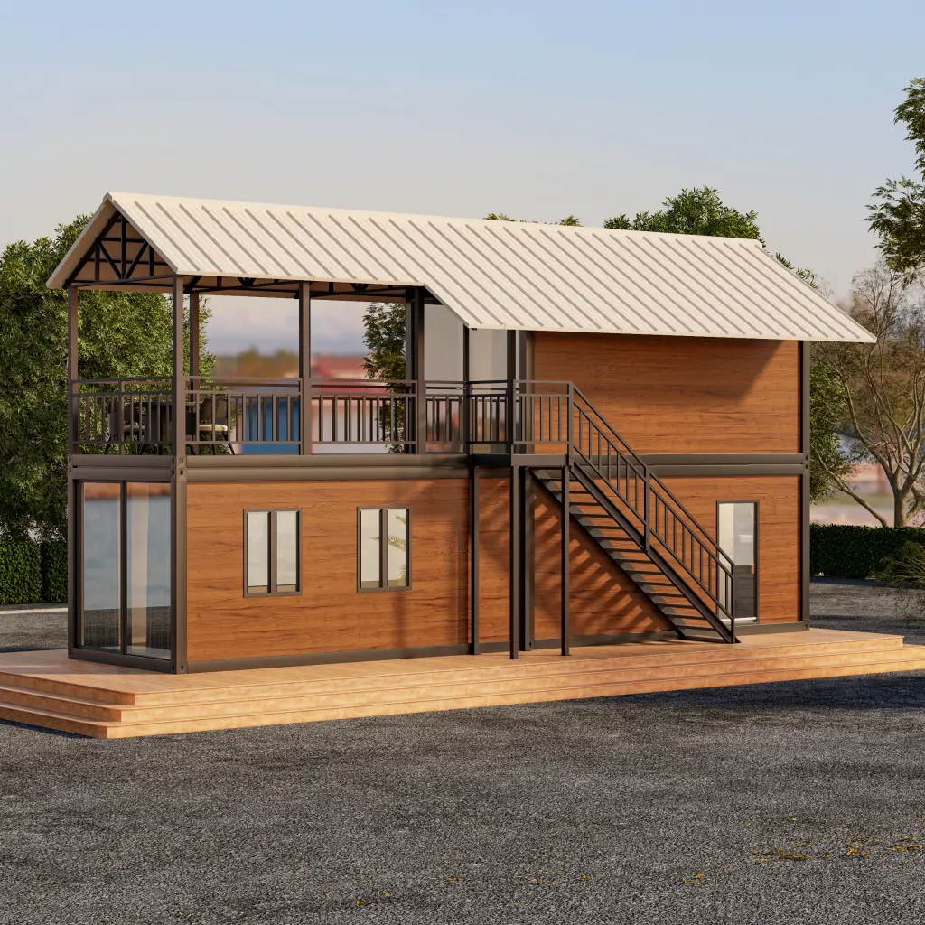 Modern wood-grain modular home with a spacious outdoor deck. Custom designs for resorts, villas, and high-end offices.