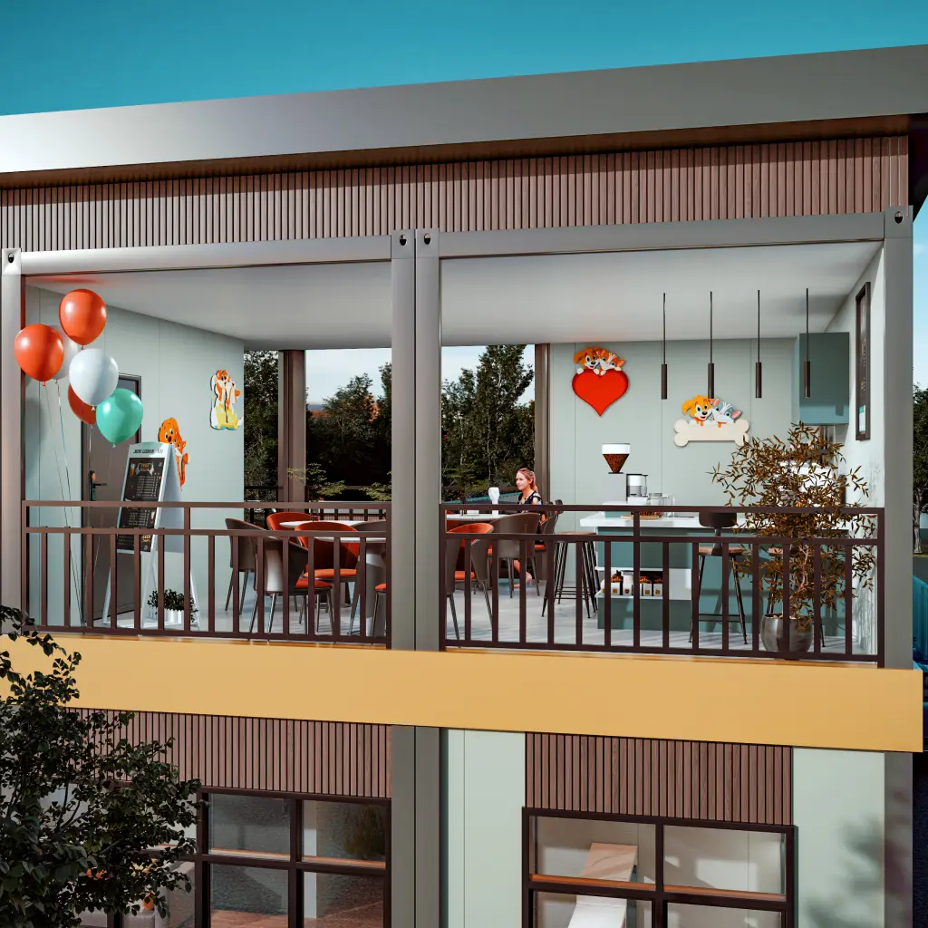 Premium 2-story prefab pet boarding facility with panoramic glass and wood finish. Ideal for pet hotels, vet clinics, and resorts.
