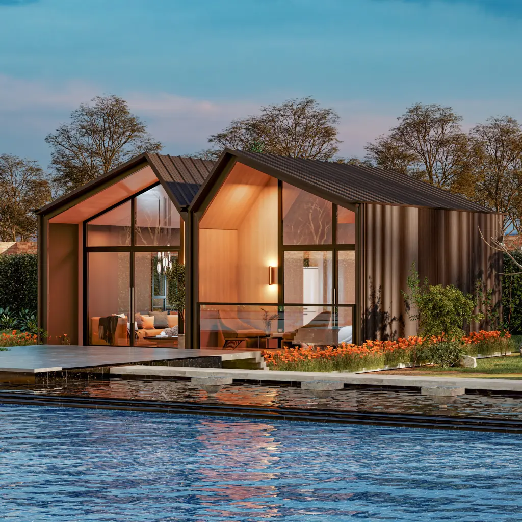 Modern dual-pitch prefab home with floor-to-ceiling glass walls. Perfect for high-end resorts, villas, and creative studios.
