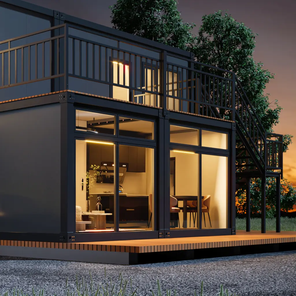 Luxury 2-story modular home with a unique cantilever design creating a built-in carport. Features industrial aesthetics and large glass walls.
