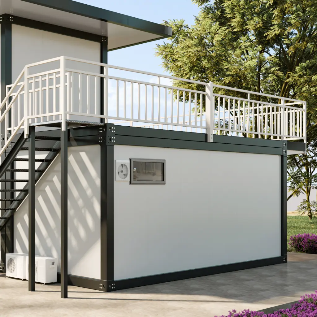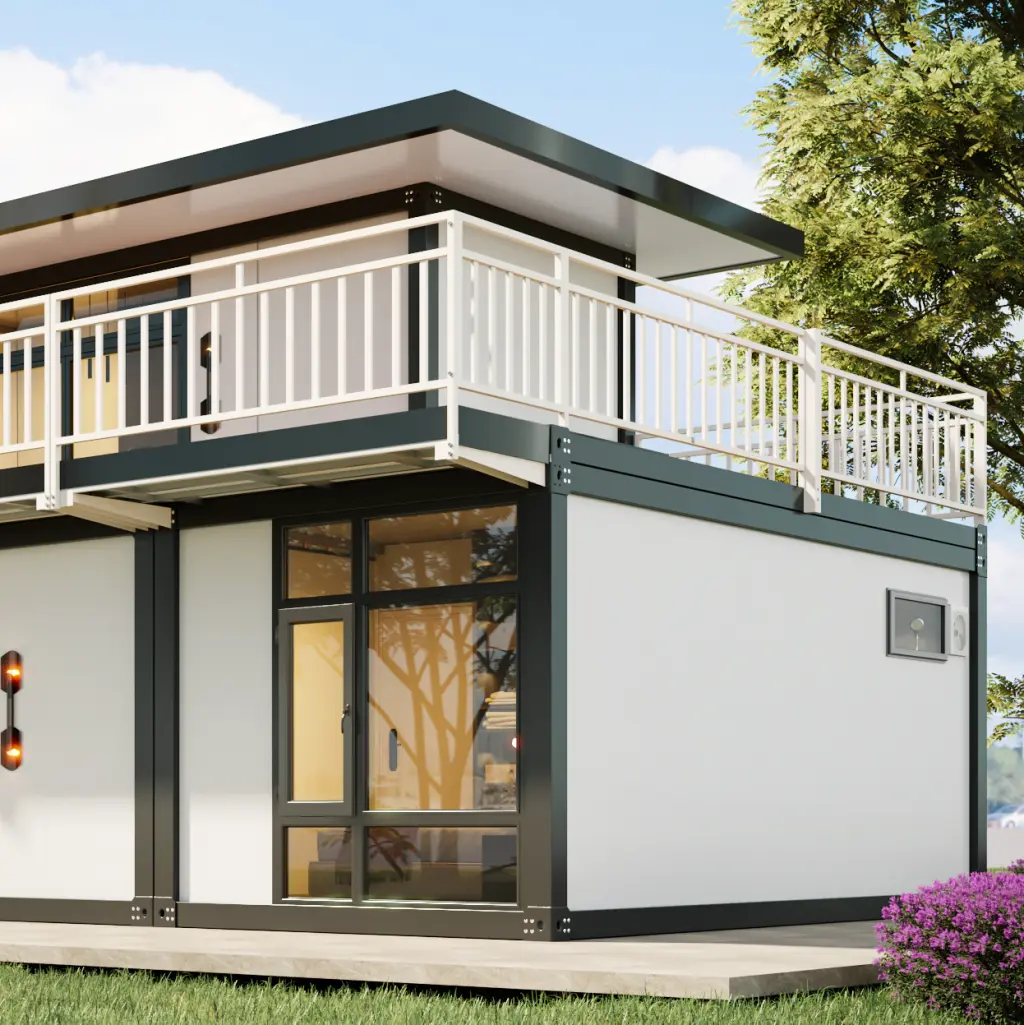 Elegant white 2-story prefab villa featuring a large balcony and panoramic glass windows. Ideal for modern living and resorts.
