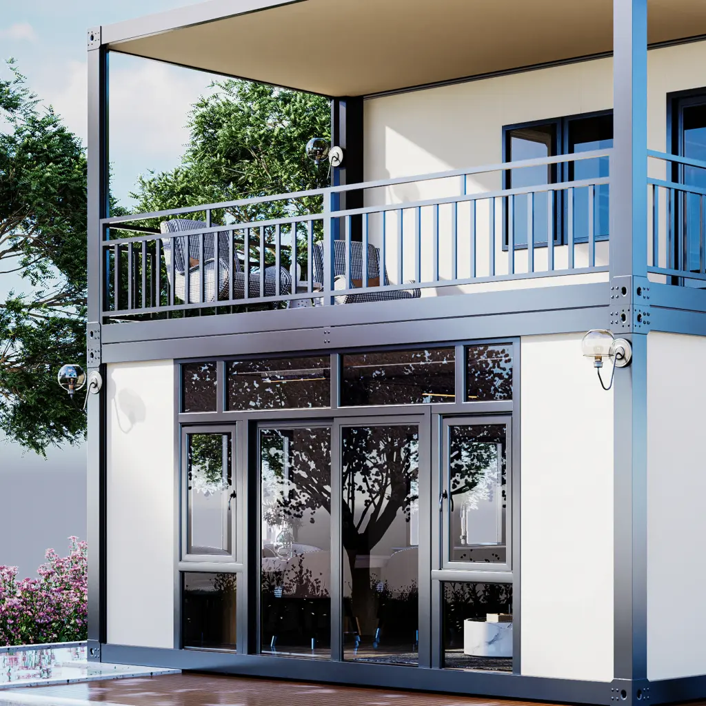 Elegant prefab villa with a spacious 2nd-floor balcony and awning. Features large glass doors and external stairs for modern living.