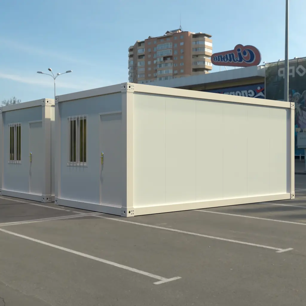 Expandable prefab container units with secure windows. Durable and versatile for temporary housing or site offices.