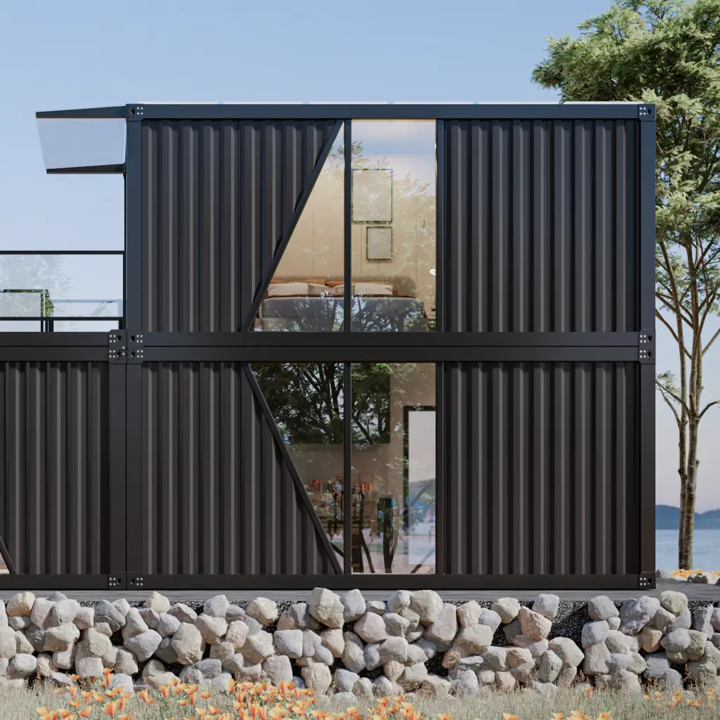 2-story black container house with trapezoidal windows and a large roof terrace. Custom prefab design for offices, cafes, and villas.