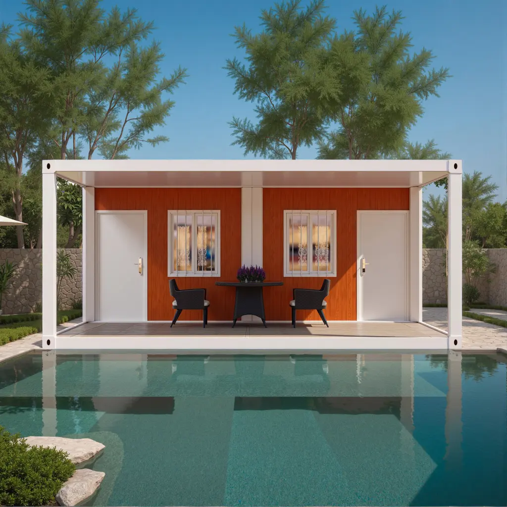 Luxury prefab units with orange wood-grain panels and steel frames. Perfect for holiday homes, garden suites, and resort living.