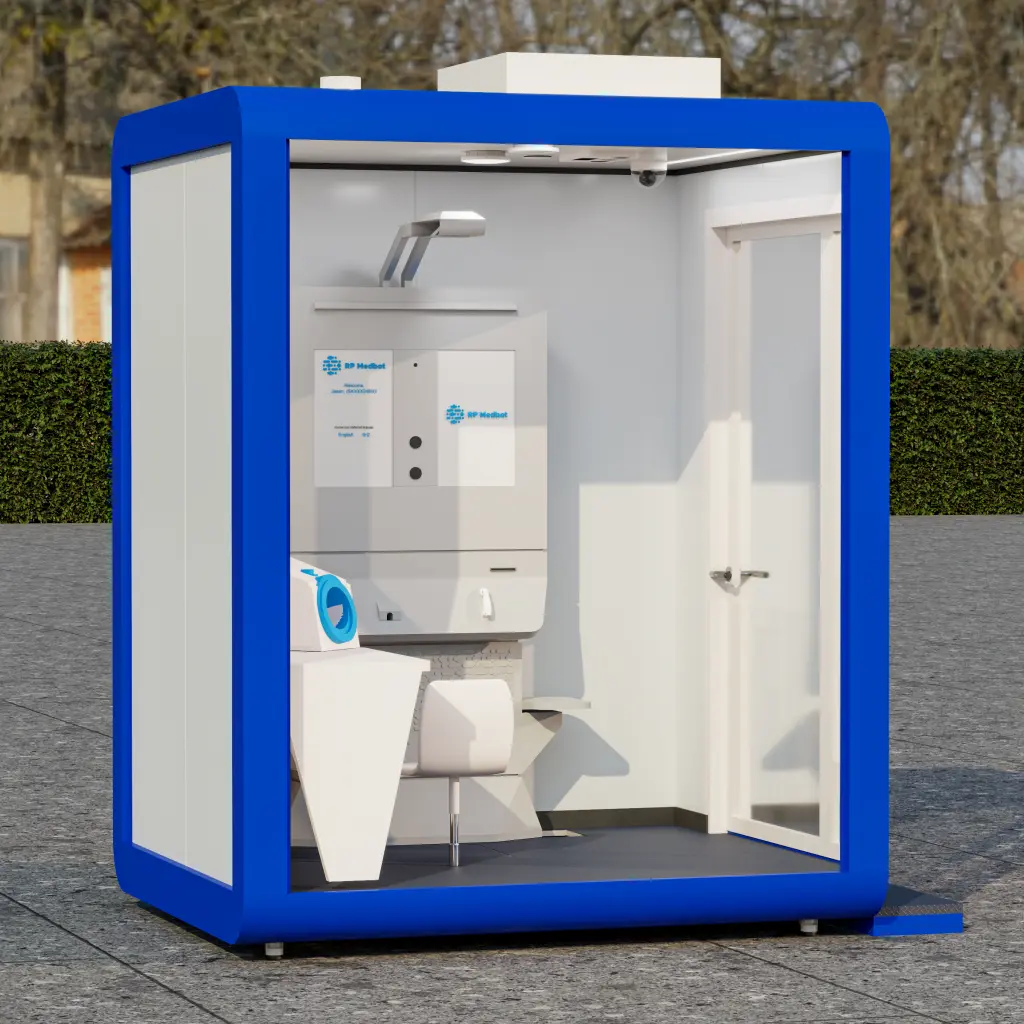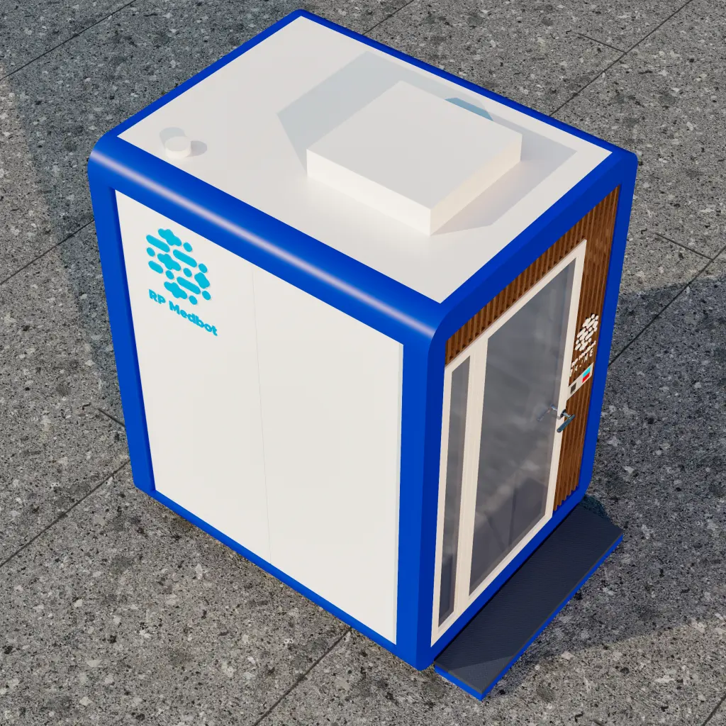 Advanced mobile medical station with glass walls and integrated check-up equipment. A hygienic and private space for clinical exams.