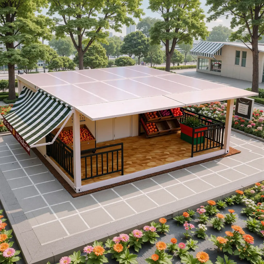 Versatile modular retail booth with a striped awning. Perfect for pop-up cafes, flower shops, and mobile street stores.
