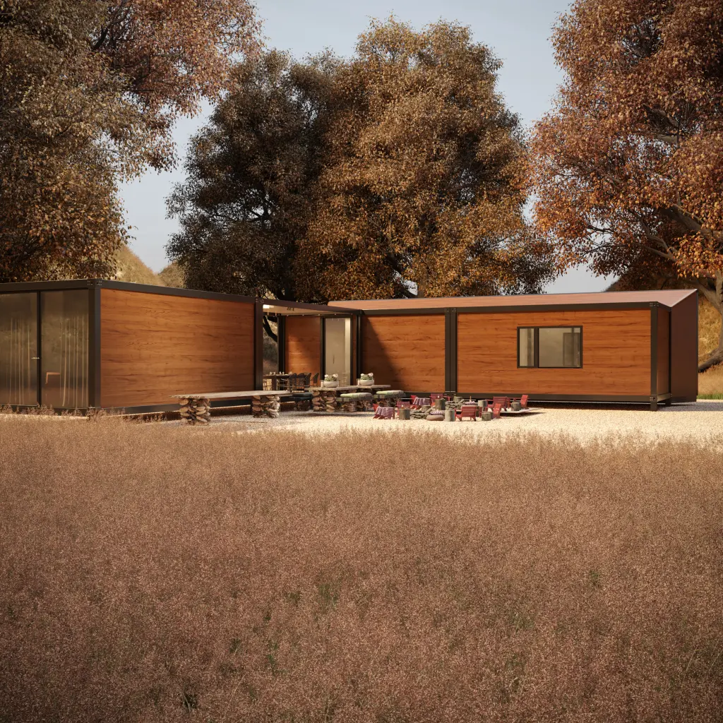 Elegant prefab cabin with panoramic glass and wood-grain finish. A durable, modern retreat perfect for scenic glamping and eco-resorts.