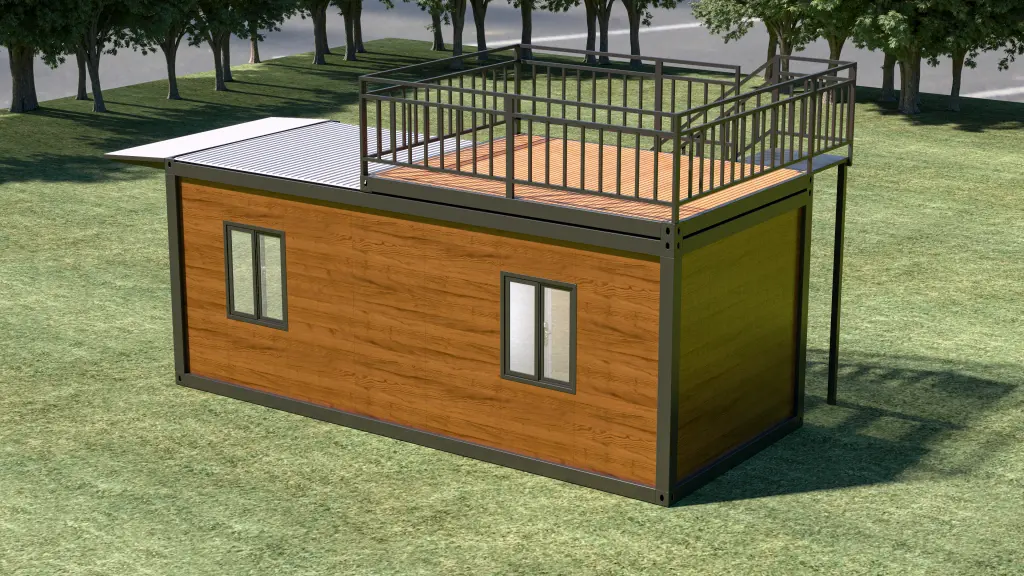 Modern wood-grain prefab home with a rooftop deck and awning. Perfect for resorts, offices, and cafes.