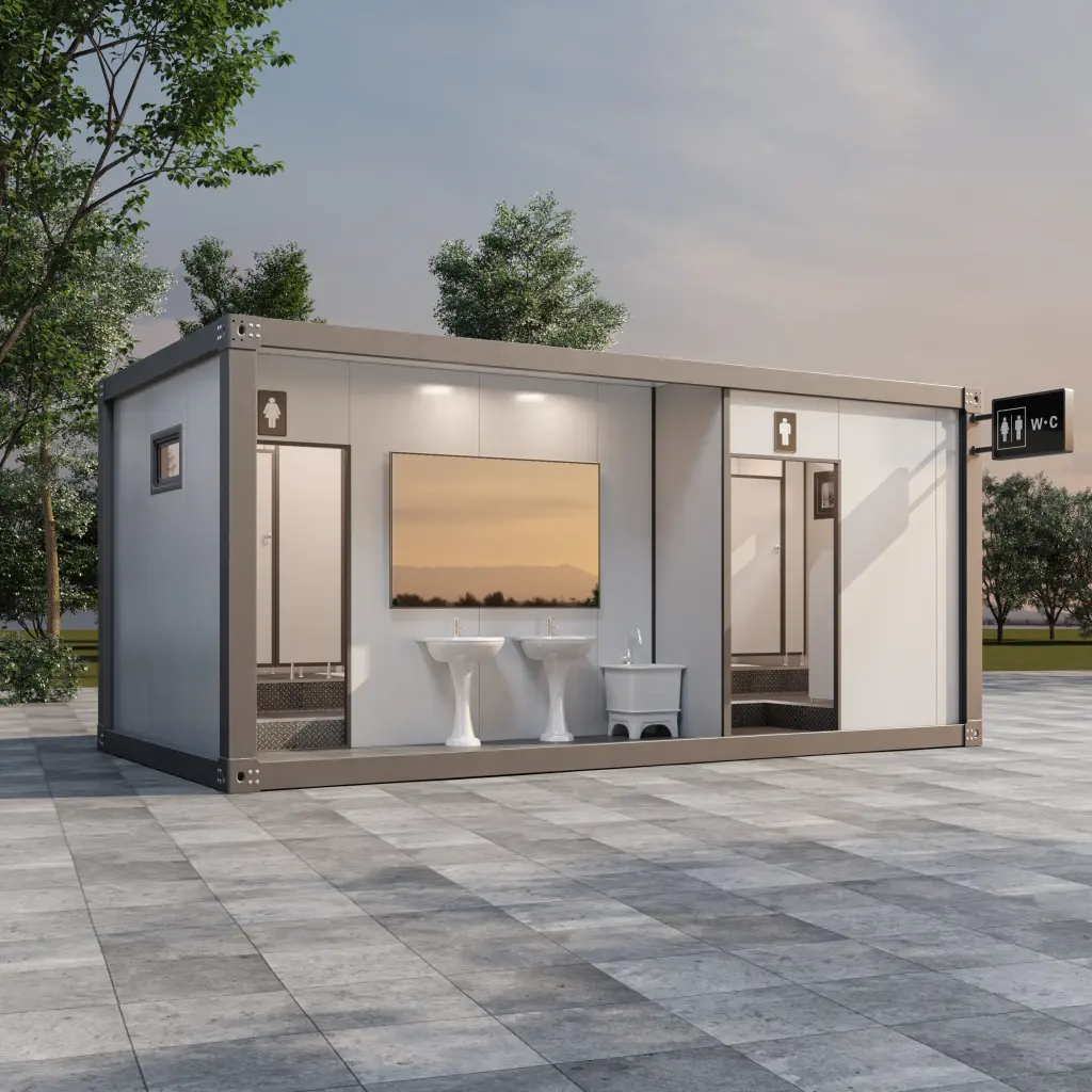 Modern prefab portable restroom with multiple cubicles and external sinks. Hygienic and ready-to-use solution for events and parks.