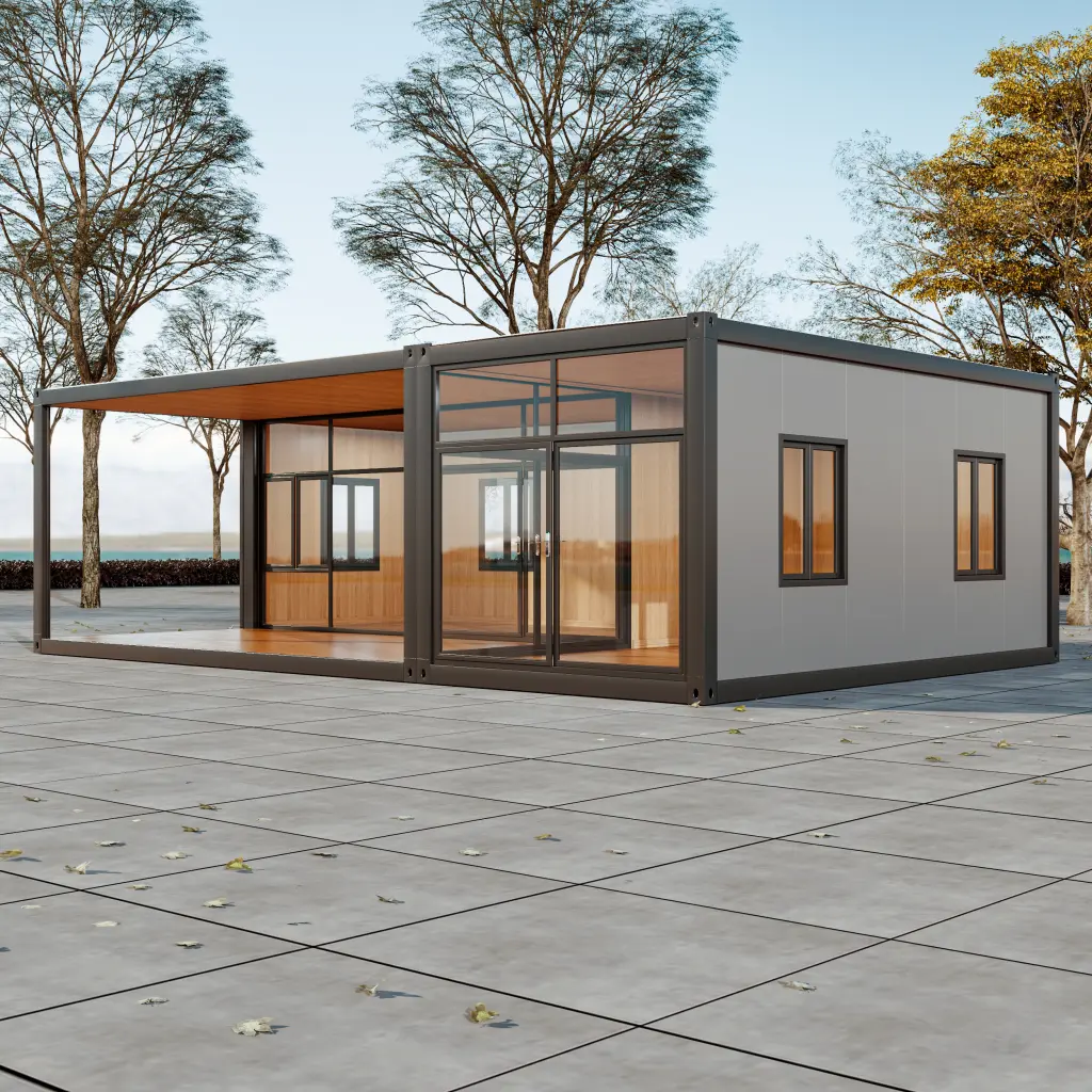 Premium steel frame prefab buildings with panoramic glass and veranda. Ideal for cafes, clinics, schools, and dorms. Durable and rapid assembly.