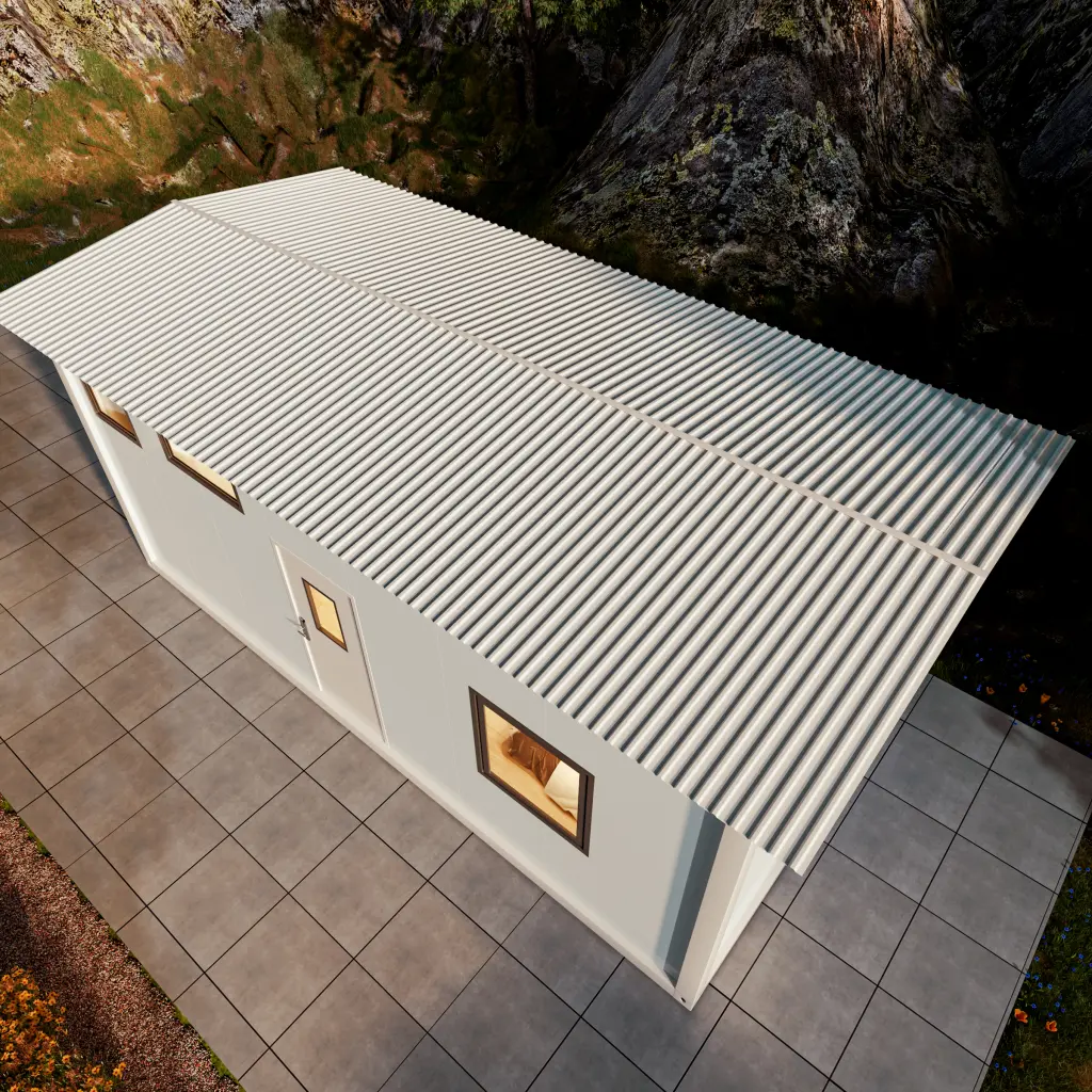 Modern prefab container studio with integrated bathroom and kitchen floor plan. Versatile for offices, tiny homes, and site housing.
