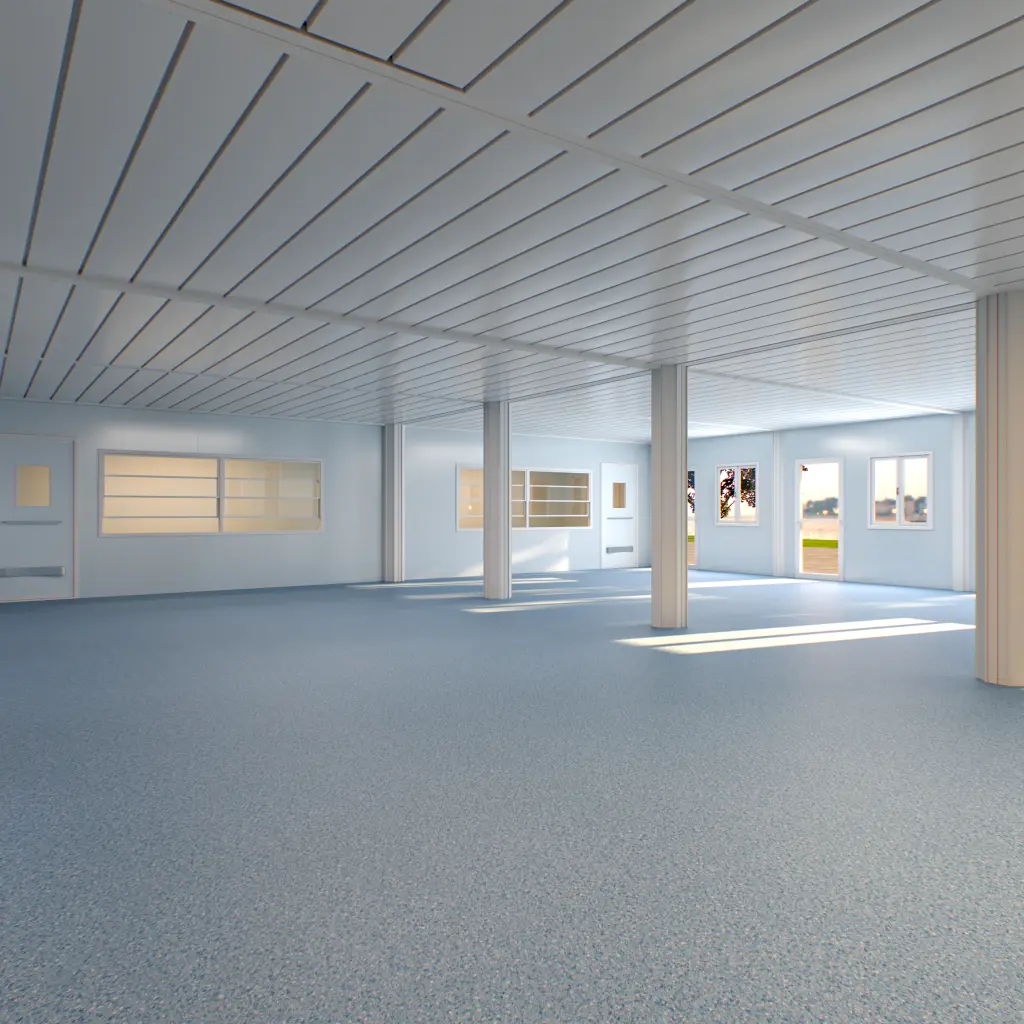 Multi-unit prefab container buildings with large open interior spaces. Ideal for offices, canteens, schools, and clinics.