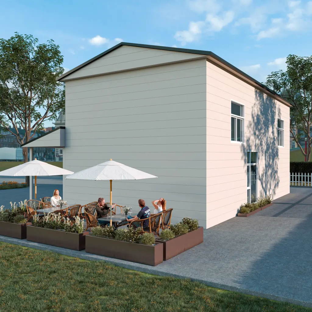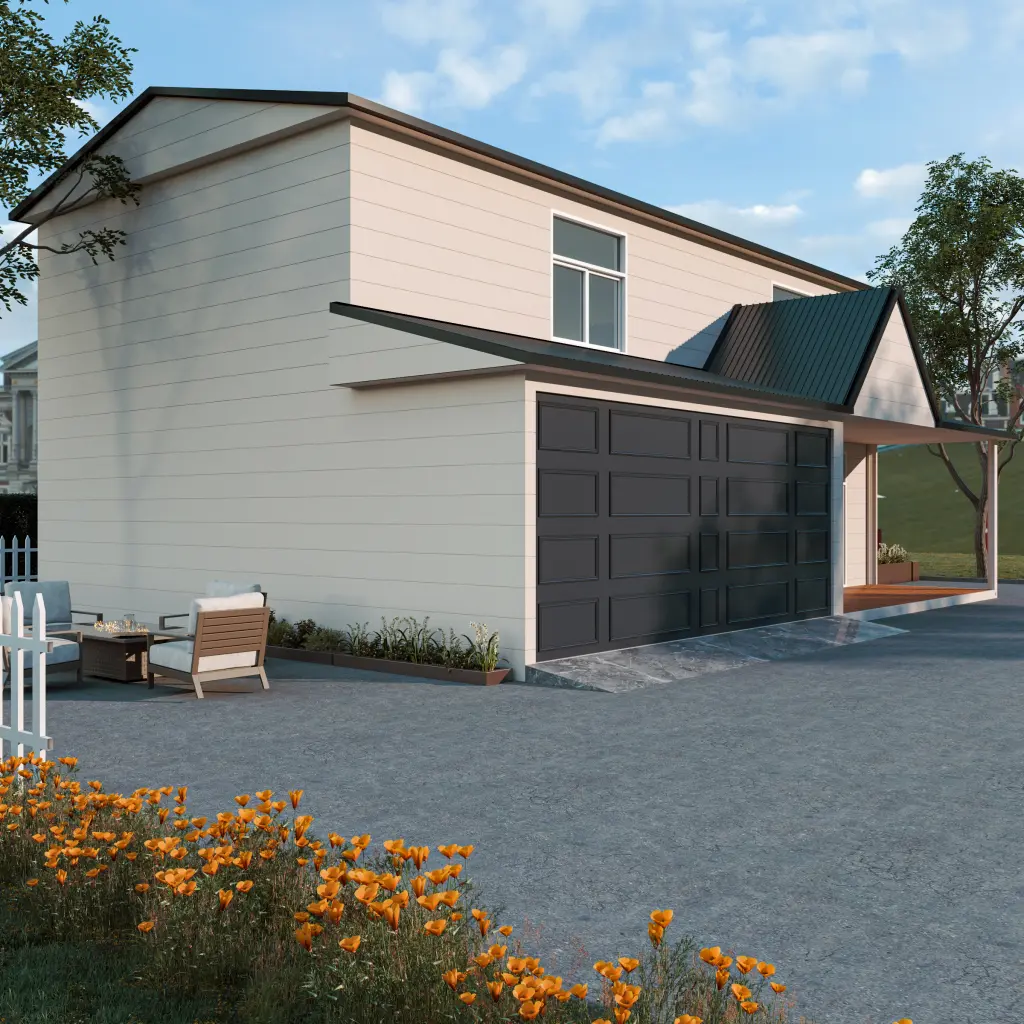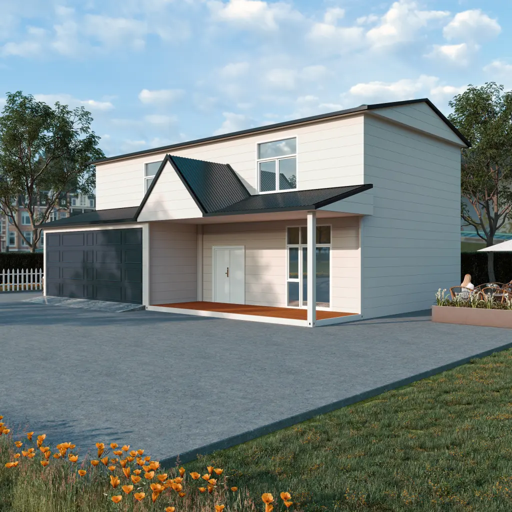 منزل جاهز أنيق بمدخل مائل ونوافذ زجاجية كبيرة. مثالي للفلل الفاخرة والمنتجعات والاستوديوهات.