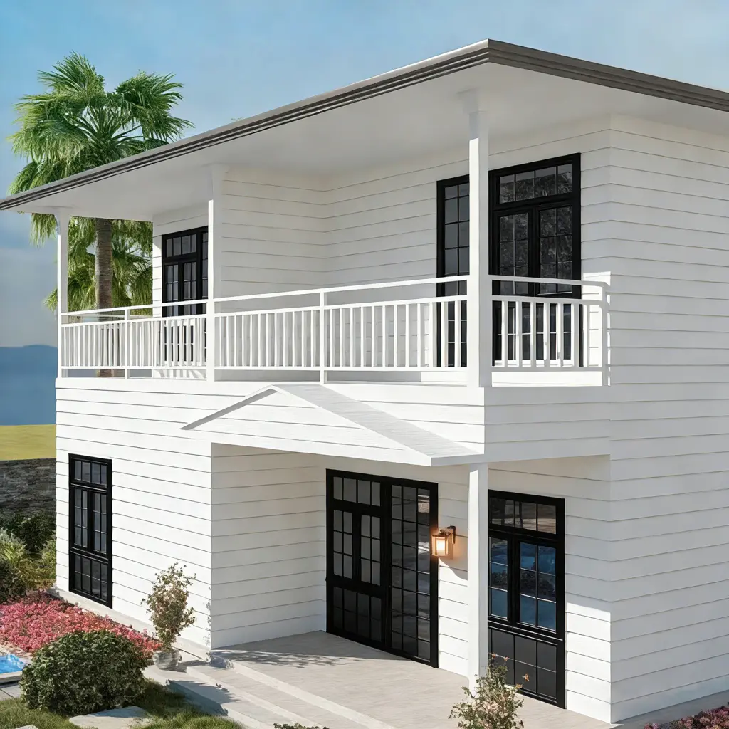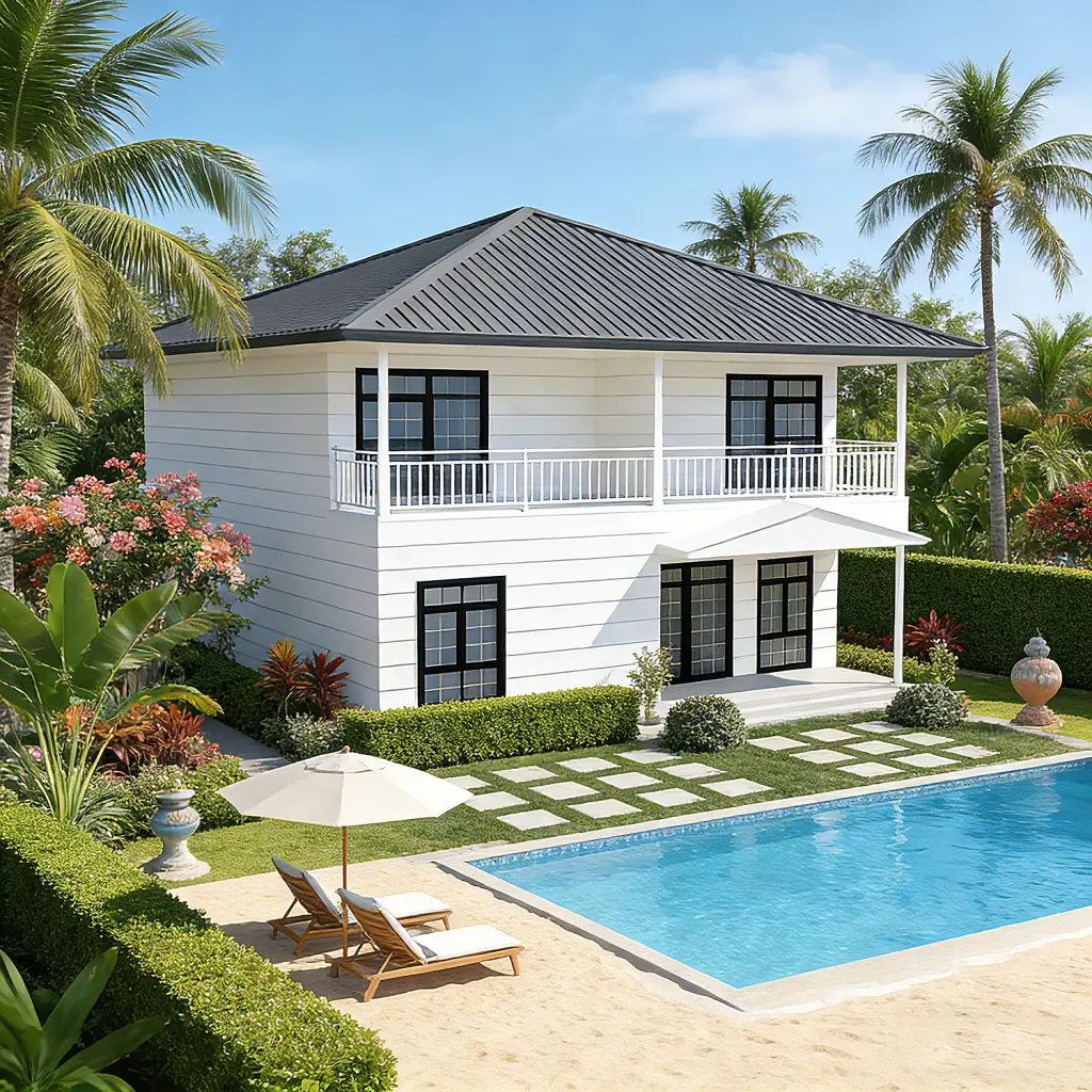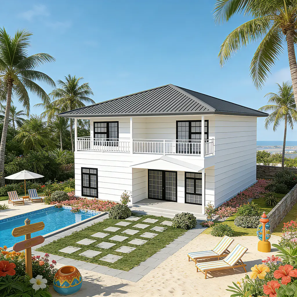 منزل موديولار أنيق مع شرفات وسقف مائل رباعي. مثالي للمنازل الشاطئية واستراحات العطلات والمنتجعات.