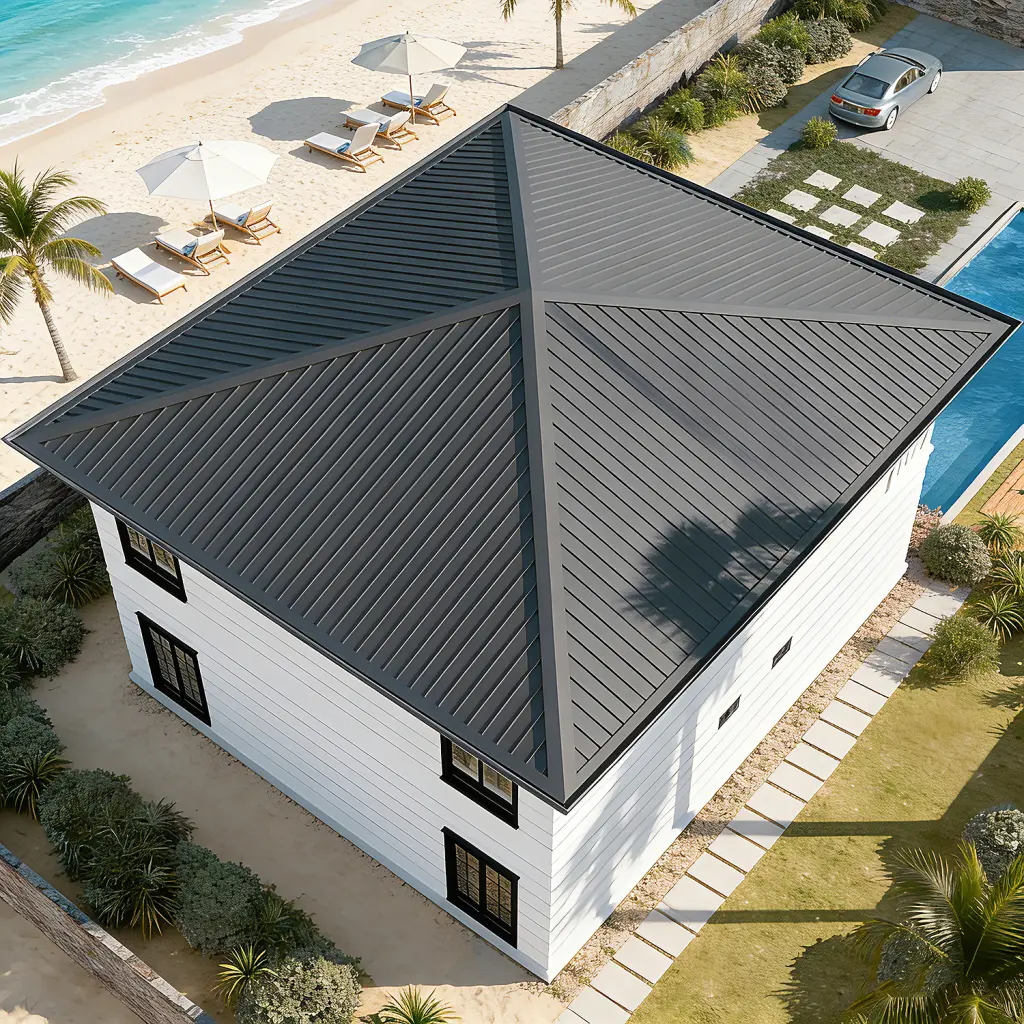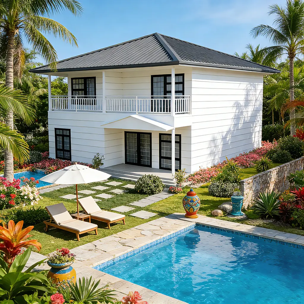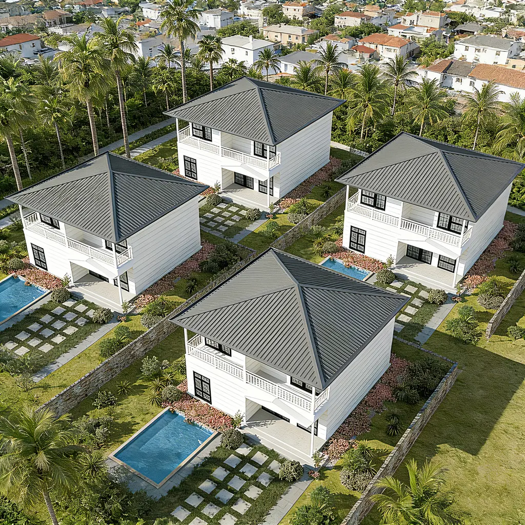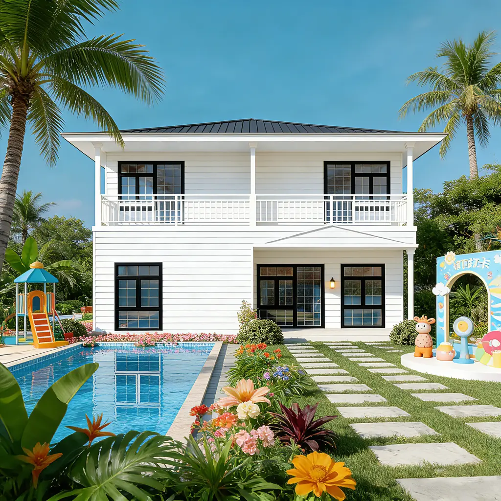 منزل موديولار أنيق مع شرفات وسقف مائل رباعي. مثالي للمنازل الشاطئية واستراحات العطلات والمنتجعات.