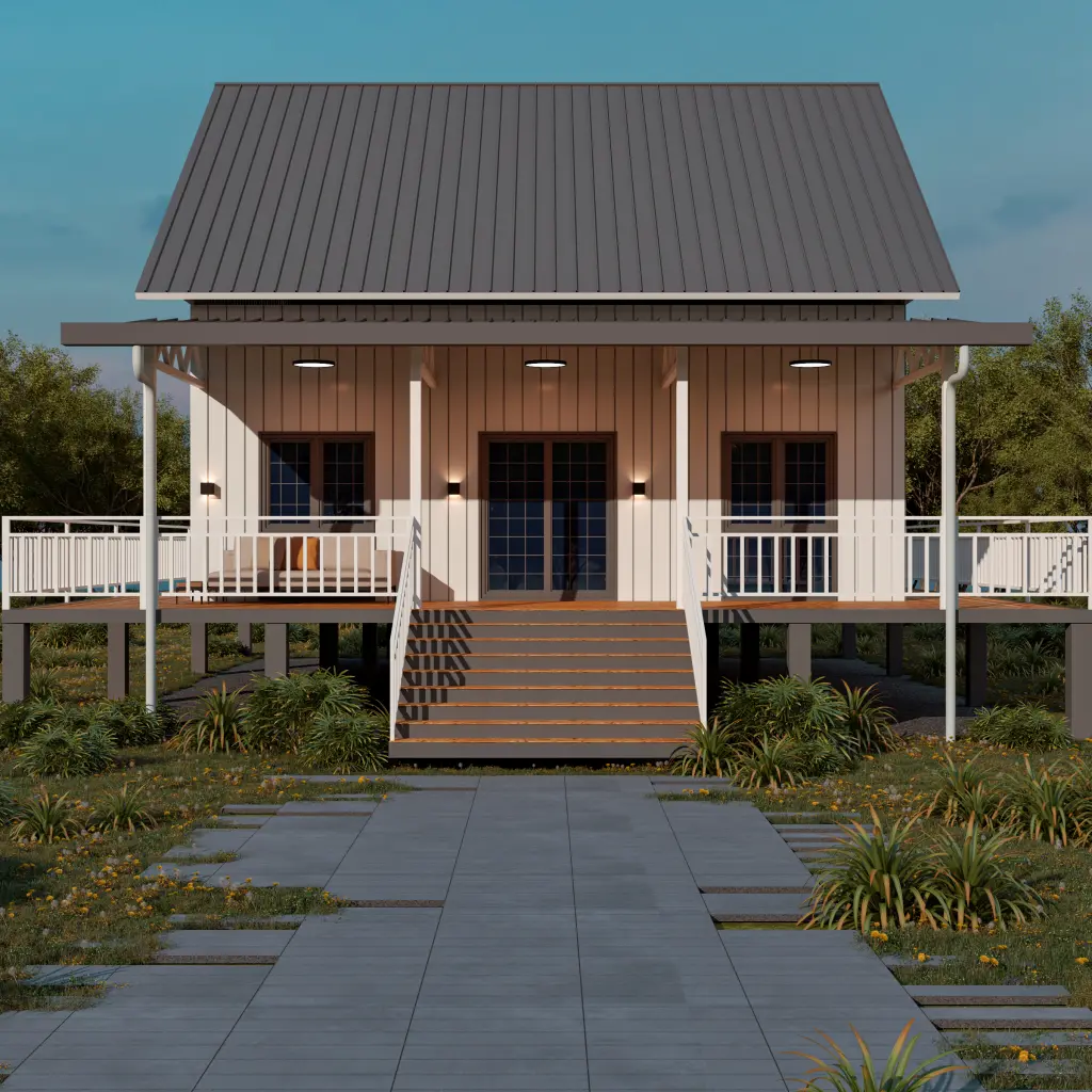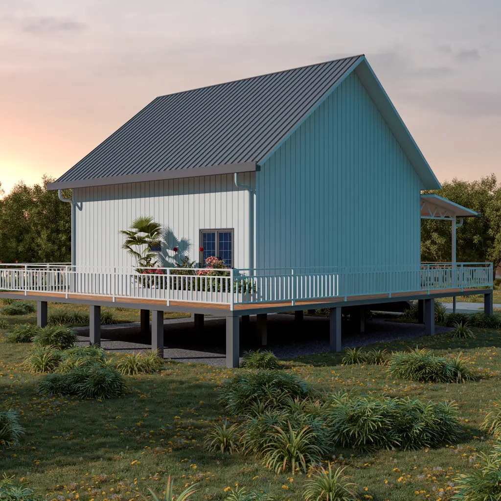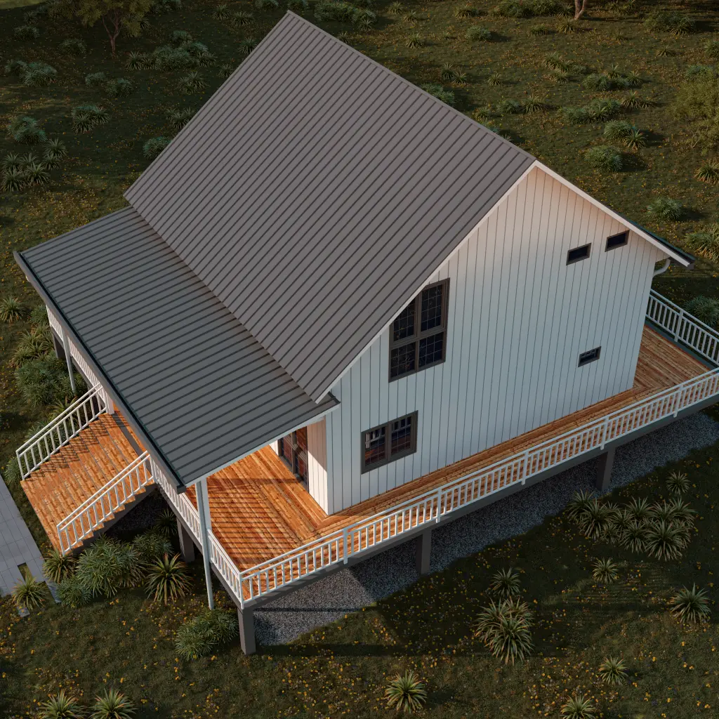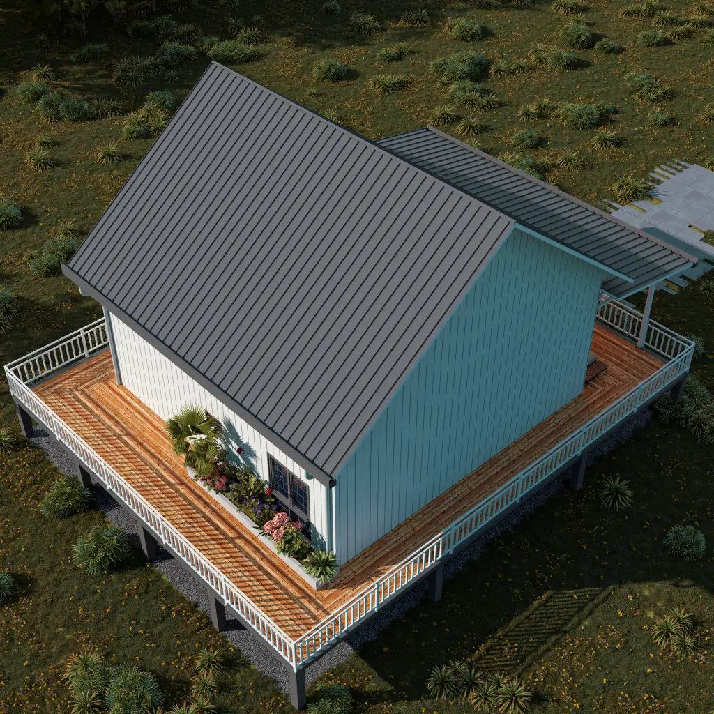 منزل جاهز أنيق بسقف مائل وشرفة واسعة محيطة. مثالي للفلل الريفية واستراحات العطلات.