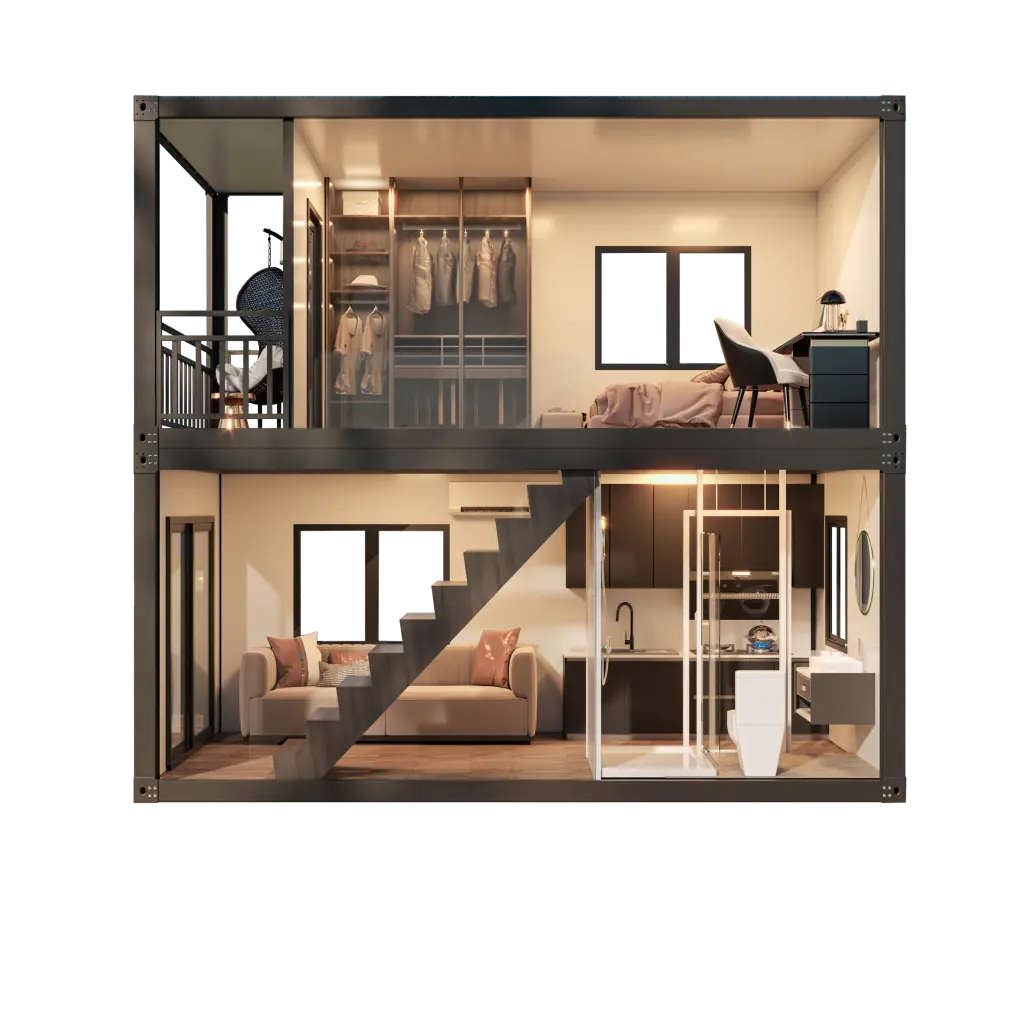 ModularDwell ofrece acogedoras casas prefab de 2 niveles con balcón y terraza. Ideal para villas vacacionales y eco-lodges.