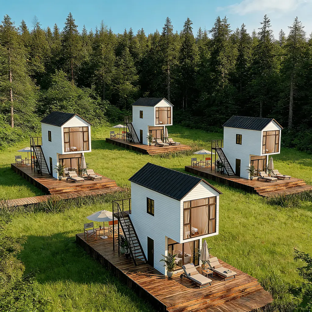 Maison préfabriquée haut de gamme avec toit en pente et parois vitrées. Idéal pour les complexes hôteliers et villas de luxe.