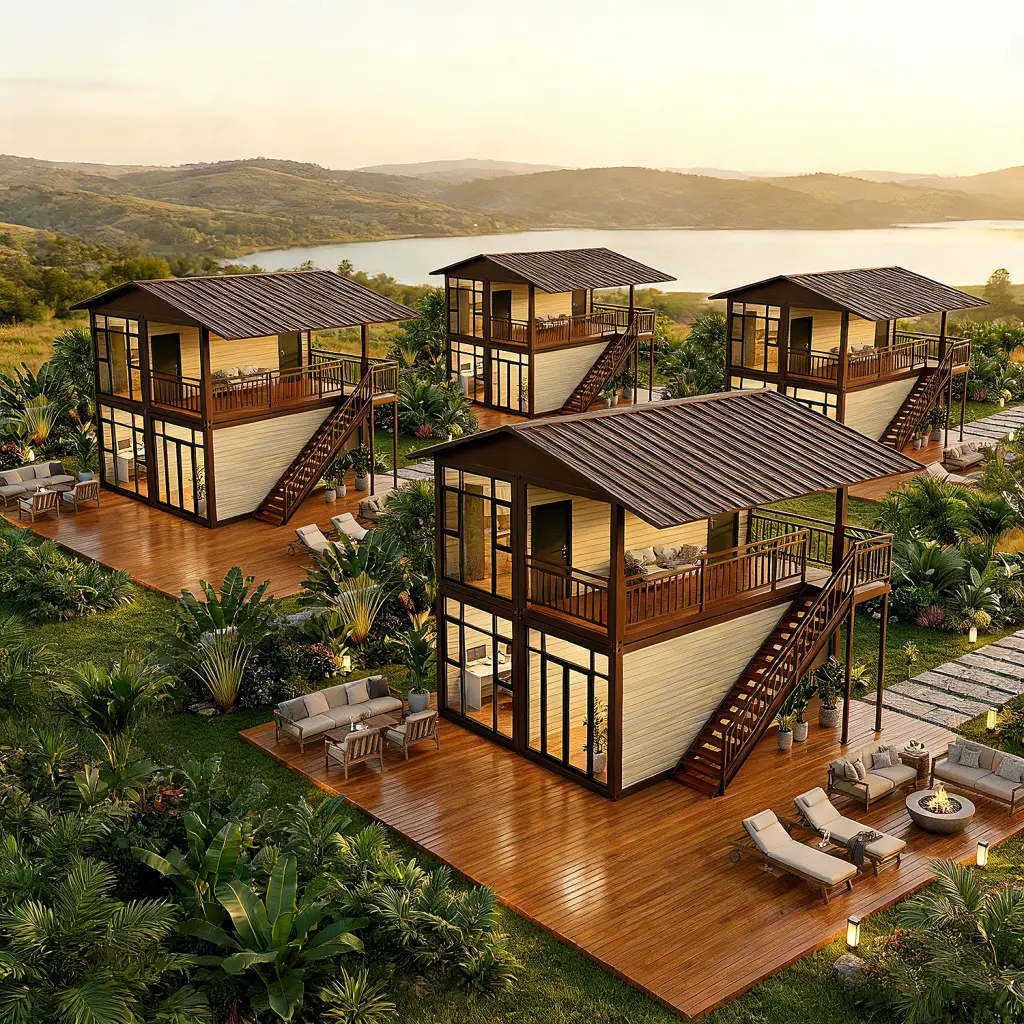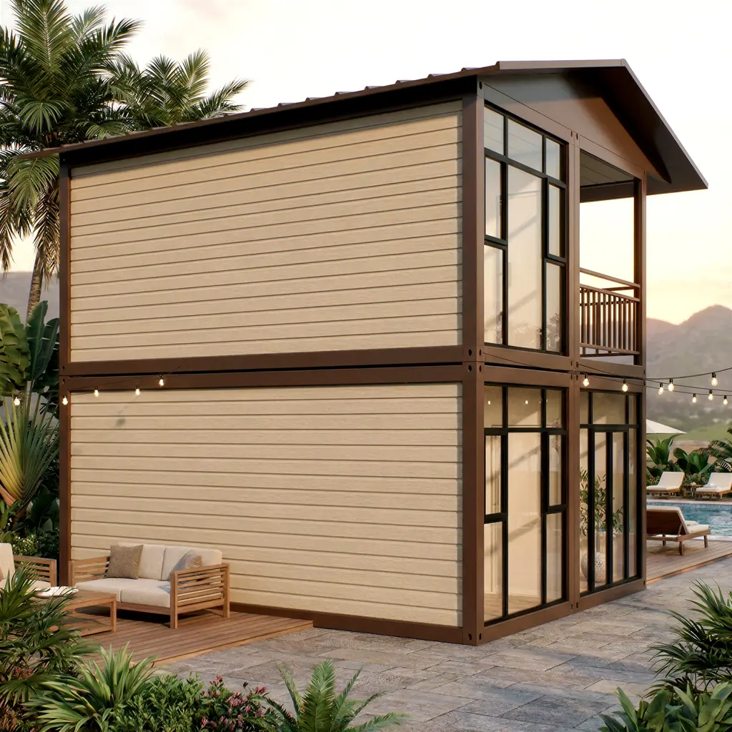 Moderne prefab woning met balkon en zadeldak. Ideaal voor resorts, kantoren en luxe villa's.