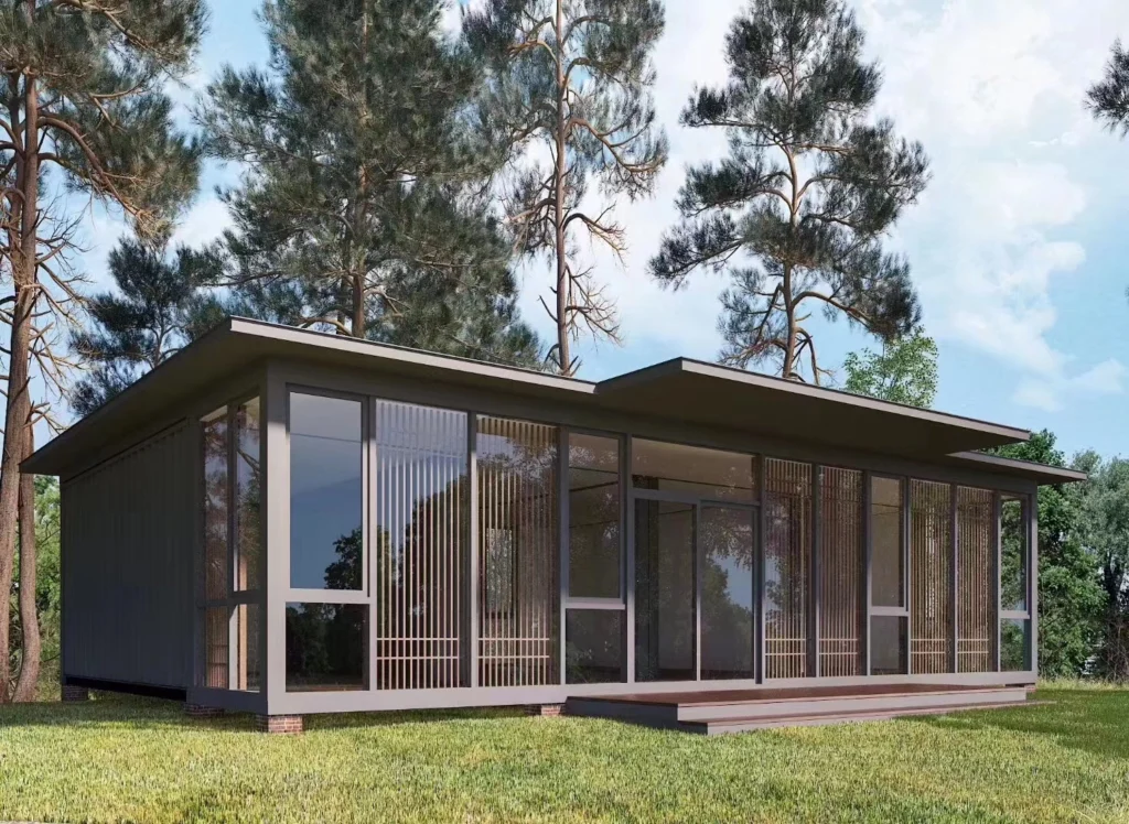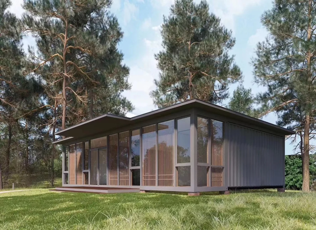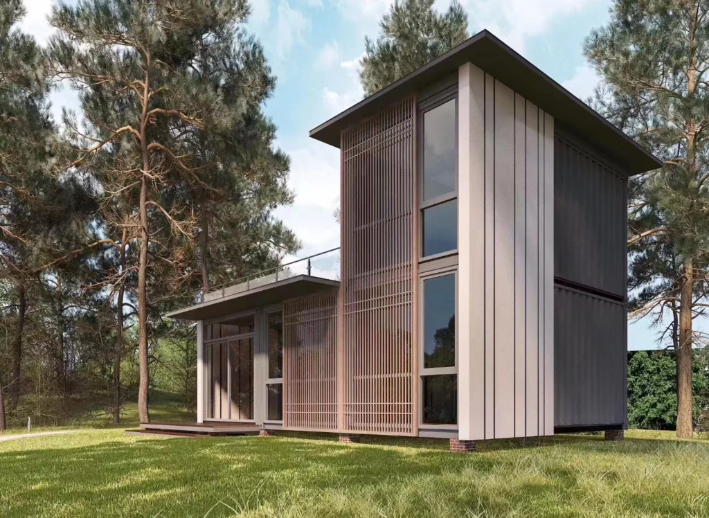 This premium project by modulardwell showcases a sophisticated two-story modular container home that achieves a warm, organic look without the maintenance challenges of real wood. Designed for longevity and style, this structure is an ideal solution for luxury vacation rentals or modern garden studios.