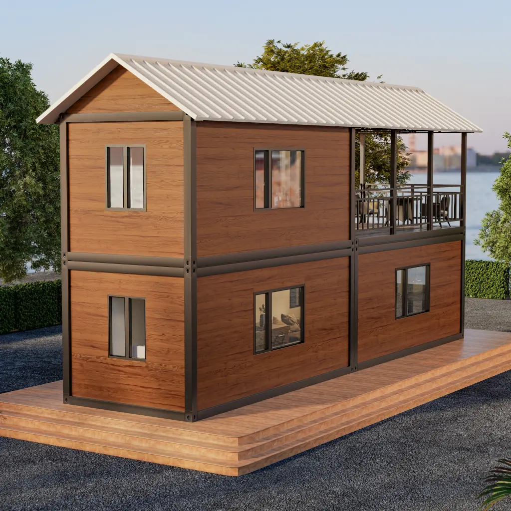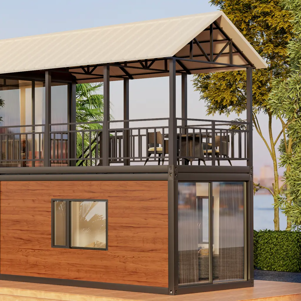 Villa pré-fabricada premium com acabamento em madeira e terraço. Ideal para resorts, alojamento local e escritórios.