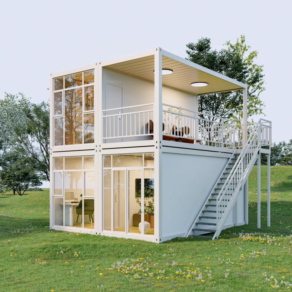 Минималистичный 2-этажный контейнер с большой террасой и стеклянными стенами. Идеально для офиса или виллы.