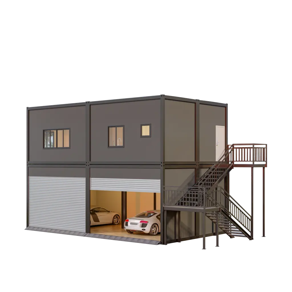 Garaj ve dış merdiven entegreli modern prefabrik yapı. Konut ve araç muhafazası için estetik çözüm.
